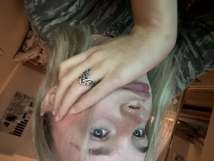 A fair-skinned woman is facing the camera with blue eyes and blonde hair. Her hand is near her forehead and on her finger is an ornate silver ring. She wears a camouflage-patterned top. A small silver hoop pierces her nose. The background is a room with furniture and wall decorations. The image is slightly tilted.