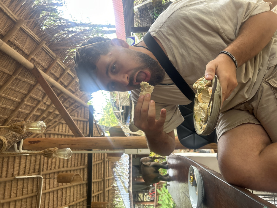 A man with dark hair, a beard, and sunglasses perched on his head is holding a small piece of food in his left hand, appearing ready to eat it. In his right hand, he holds a silver bowl filled with a salad-like mixture. The background features a thatched roof structure with exposed wooden beams and hanging light fixtures. A dark wooden table is also visible.