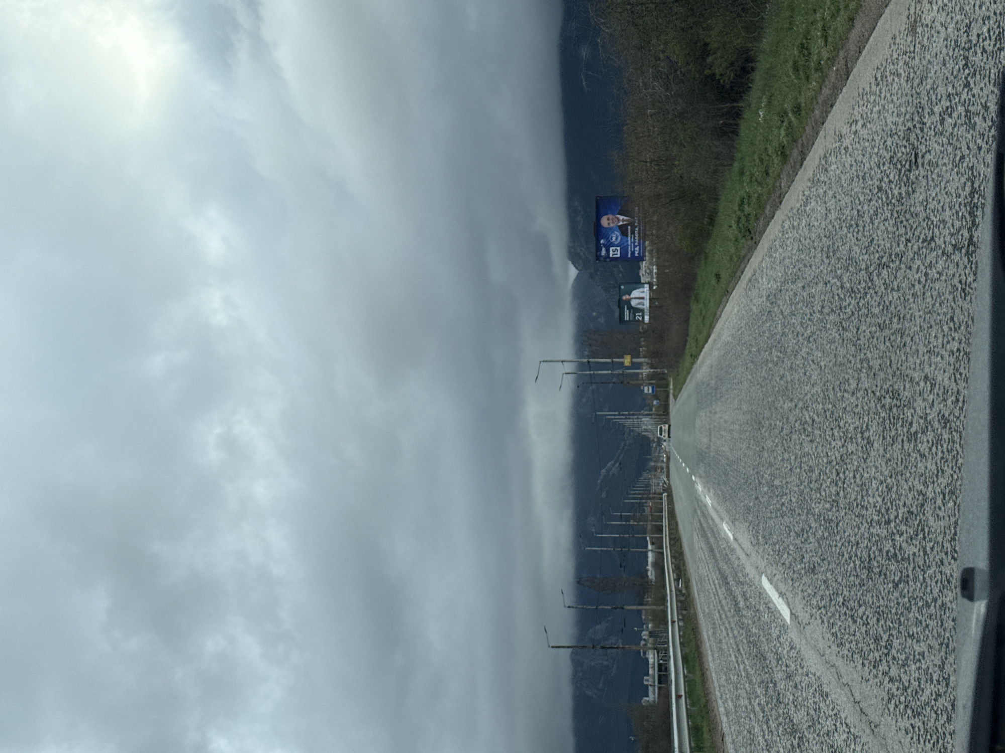 The image depicts a straight, two-lane asphalt road leading into the distance under an overcast sky in Vratsa, Bulgaria. Heavy grey clouds dominate the upper two-thirds of the frame, with darker, partially cloud-obscured mountains forming the background. The asphalt road surface in the foreground shows a coarse texture and is marked by a solid white lane divider on the left, transitioning to a dashed white line further down the road. The perspective is from inside a vehicle, with a portion of the dashboard visible at the bottom edge of the frame. On the left side of the road, a metal guardrail runs parallel to the roadway. Beyond it, a series of utility poles extends into the distance, with sparse vegetation and what appear to be industrial structures or buildings in the mid-ground. On the right side of the road, a strip of grass and brush separates the road from the background. Two large billboards are visible. The more prominent billboard on the right features a man identified as "МАРТИН ХАРИЗАНОВ" alongside text that includes "РЕД. РАБОТА. РЕЗУЛТАТИ." and numbers "15" and "10.2". A second billboard to its left displays another man and the number "21". A line of utility poles is also present on this side, extending down the road. One white passenger vehicle is observed in the distant right lane, traveling in the same direction as the camera. Numerous streetlights are positioned along both sides of the road, receding into the background. No pedestrians are visible.
