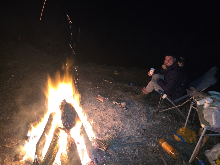 A nighttime scene depicts an outdoor gathering around a campfire in Cherven Bryag, Bulgaria. A single male subject, appearing to be an adult in his 20s or 30s, is seated in a grey folding camping chair on the right side of the frame. He wears a dark, possibly navy, winter jacket with a fur-lined hood, light grey trousers, and dark boots. He holds a white disposable cup in his right hand, positioned near his chest, and is smiling directly towards the camera. To the left, a substantial bonfire burns brightly, emitting intense orange and yellow flames from multiple logs. Numerous sparks are visible ascending into the dark sky above the fire. The ground immediately surrounding the fire is composed of ash and debris. Adjacent to the seated individual, on his right, is a small, square folding camping table. On the table, two white disposable cups and a clear plastic bag containing an unidentifiable white item are visible. On the ground near the table and the subject, an orange plastic bottle, a yellow plastic bag, and a blue water bottle are present. The background is uniformly dark, indicating a lack of ambient light sources beyond the campfire. The ground beneath the entire scene appears to be uneven, bare earth or dirt.