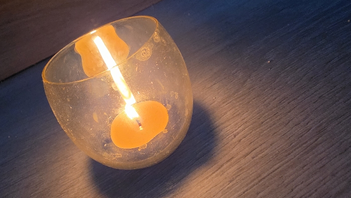 - "An orange-yellow candle with a visible flame is burning inside a clear, bell-shaped glass holder, resting on a dark, wood-grained surface" by FM-UgNOv2, licensed under CC BY 4.0