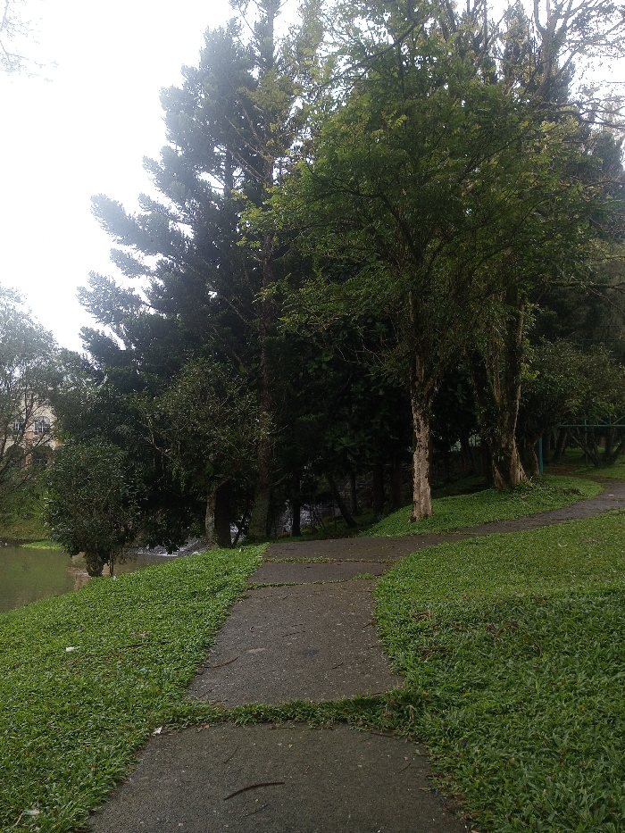 The image depicts an outdoor park environment in Babaliya Mal., India, under an overcast sky. A dark gray paved pathway, appearing damp, traverses the foreground from the bottom center, curving towards the right mid-ground. This path is bordered by neatly manicured green grass on both sides. To the left of the pathway, a body of water, consistent with a pond or calm river, is visible, with a small cascading water feature or outflow present at its edge in the mid-left. The mid-ground and background are densely populated with a variety of trees, including several tall coniferous trees with distinct layered branches and numerous broadleaf trees exhibiting vibrant green foliage. A light-colored, multi-story building is partially visible through the trees on the far left side of the scene. No individuals or animate subjects are present within the frame.