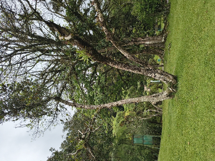 A vibrant green lawn meets a lush, dense forest in this image. Several mature trees with lichen-covered trunks stand along the border, their branches stretching towards the sky. Beyond, a tapestry of green foliage signifies a rich forest ecosystem. A glimpse of a pale sky is visible through the branches. A structure made of green squares sits near the bottom of the frame.