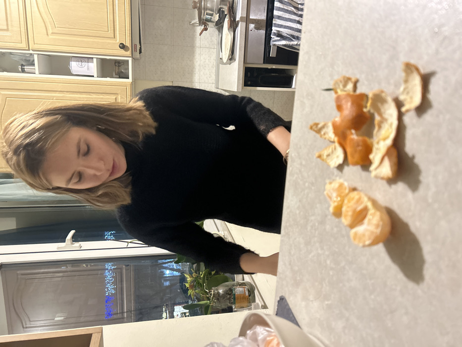 An indoor scene depicts a light-haired female subject, approximately 20-30 years old, positioned within a residential kitchen in Sofia, Bulgaria. The subject wears a dark, long-sleeved garment and is observed looking downwards and slightly to her right, her hands partially obscured below the visible frame. On a light-colored countertop in the immediate foreground, several separated tangerine segments and multiple pieces of orange peel are arranged, indicating the consumption or preparation of citrus fruit. The background reveals light-colored, possibly beige or pale wooden, overhead kitchen cabinets with various items stored within. A stainless-steel range or oven appliance is visible below the cabinets to the right, with a white and blue striped towel draped over its handle. To the left of the subject, a large window displays a blurred nighttime urban cityscape with distant blue and white lights, confirming the time of day as evening or night. A potted plant is visible on the windowsill.