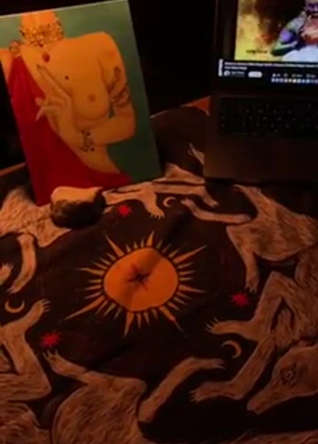 The video displays a dark and ambient space with a table covered by a cloth. The cloth features a sun symbol in the center surrounded by wolf illustrations. The table also holds a laptop playing a YouTube video, a painting of a woman, and a rock. A hand briefly enters the frame, waving over the table.