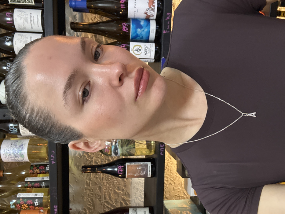 The image displays a close-up portrait of a female subject positioned against a background of wine bottles on shelves. The subject, a Caucasian female, is shown from the mid-chest up, with her head slightly angled to the viewer's right and her gaze directed towards the camera. Her hair is pulled back, revealing her forehead and ears, where small, silver-toned hoop earrings are visible. She wears a silver chain necklace with a small, pavé-set initial "A" pendant. Her attire consists of a dark brown, short-sleeved top. Her lips are slightly parted, exhibiting a glossy finish. The background features two black shelves stacked with numerous glass wine bottles. These bottles vary in size, shape, and color (predominantly dark brown, green, and clear) and bear diverse labels. Several labels include handwritten price tags in pink or purple ink, such as "179", "169", "159", and "119". Crucially, some labels display Hebrew text, directly indicating the location is in Israel. One label prominently features the English word "HARU," and another below a shelf is marked "Funky." The wall behind the shelves is textured, appearing as light beige or sand-colored stone or plaster. The environment suggests an indoor commercial establishment, specifically a wine shop or bar. Based on the presence of Hebrew text and the urban commercial context, the location is confirmed to be in Israel, most likely within the city of Tel-Aviv.