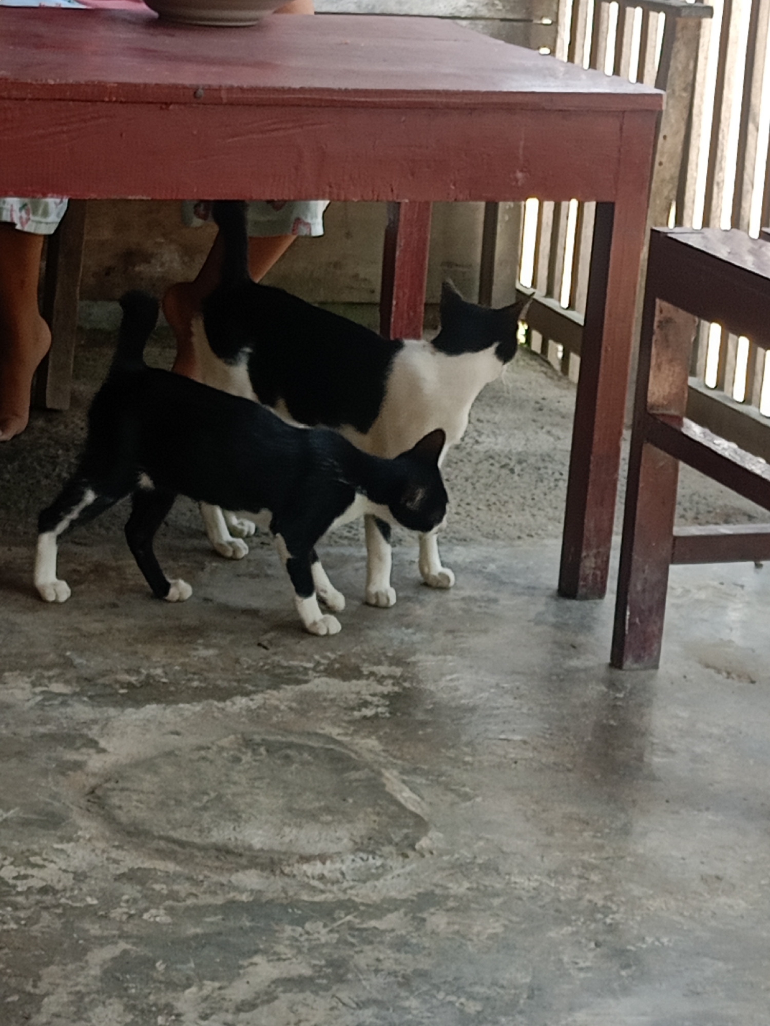 The scene, located in Lhokseumawe, Indonesia, depicts an indoor or covered outdoor area with a mottled grey concrete floor. Two domestic bicolored cats are present. In the left foreground, a cat predominantly black with white paws and lower legs is observed in motion, walking towards the right side of the frame with its head slightly lowered. Directly behind it, a second cat, predominantly white with black markings on its head, back, and tail, stands facing right, looking beyond the frame. Human presence is indicated by the partial visibility of two pairs of bare legs, wearing patterned light-colored shorts, positioned beneath a dark red-brown wooden table. A light-colored bowl is partially visible on the tabletop in the upper left corner. A dark red-brown wooden chair leg is visible on the far right. The background features a vertical slatted wooden structure, through which bright light is visible, suggesting an exterior boundary or a partitioned space.