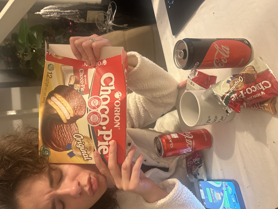 - "A person holding a box of Orion Choco-Pie Original, alongside a mug with Hebrew text, a black can of Coca-Cola Zero, a red can of Coca-Cola Classic, and a wrapped Choco-Pie snack" by FM-63vWS2, licensed under CC BY 4.0