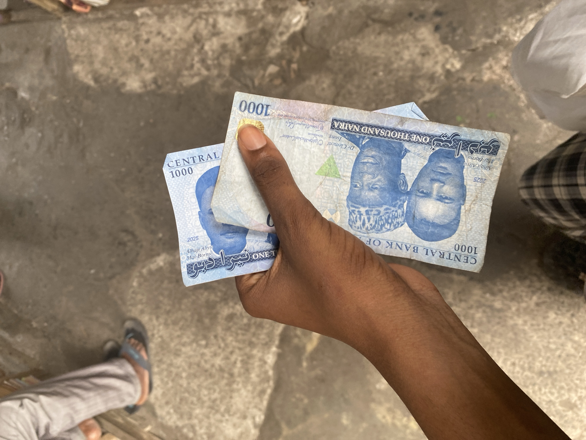 A dark-skinned right hand holds a stack of crumpled blue Nigerian 1000 Naira banknotes. The top note clearly displays the portraits of Dr. Clement Isong and Alhaji Aliyu Mai-Bornu, along with the text "ONE THOUSAND NAIRA" and "CENTRAL BANK OF NIGERIA." The background consists of a rough, grey concrete or paved ground. In the upper left quadrant, the lower legs and feet of another individual wearing light-colored trousers and blue flip-flops are partially visible. In the lower foreground, parts of the subject's own legs are visible, wearing plaid trousers and a white garment. The scene is located in the city of Lagos, Nigeria.