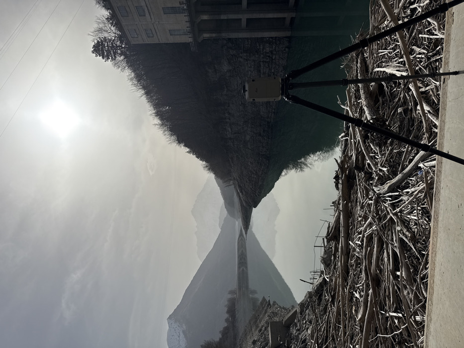 The image displays a mountainous reservoir near Corps, France, under an overcast sky with a prominent, bright sun causing glare in the upper right quadrant. In the immediate foreground, a cream-colored terrestrial laser scanner on a black tripod stands on a concrete platform. Extending from the foreground into the light greenish-blue water is a vast accumulation of dried, greyish-brown driftwood and logs, covering the exposed shoreline. The water level appears low, revealing rocky banks on both sides. To the left, distant mountains with visible snowcaps recede into a atmospheric haze. The left shoreline consists of barren, rocky slopes and exposed earth, with remnants of concrete structures visible near the driftwood. To the right, a steep, dark, tree-covered hillside rises from the water. The trees are predominantly bare deciduous species, with a single evergreen tree visible near the top of the slope. Perched on this right bank is a multi-story, light-colored concrete building, likely a hydroelectric power station or a dam structure, supported by visible pillars and featuring multiple windows. High-tension power lines are discernible horizontally across the upper sky. No individuals are present in the scene.