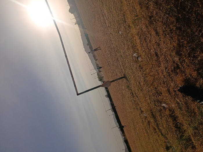 An aerial-angled photograph displays an outdoor football field located in Unguwar Saya, Nigeria, under a bright, low-angle sun positioned in the upper right quadrant of a pale blue sky. The ground comprises dry, reddish-brown earth interspersed with sparse, desiccated vegetation, presenting an uneven surface. Scattered white plastic debris is visible across the foreground and mid-ground. A dark-colored, square-shaped metal goal frame is prominent in the mid-ground, with a light-colored, possibly fabric object hanging from its left vertical post. At least seven individuals are distributed across the field, engaged in playing football. One individual stands near the right side of the goal frame, while others are positioned further back. A faint line of distant hills or structures is visible along the horizon.
