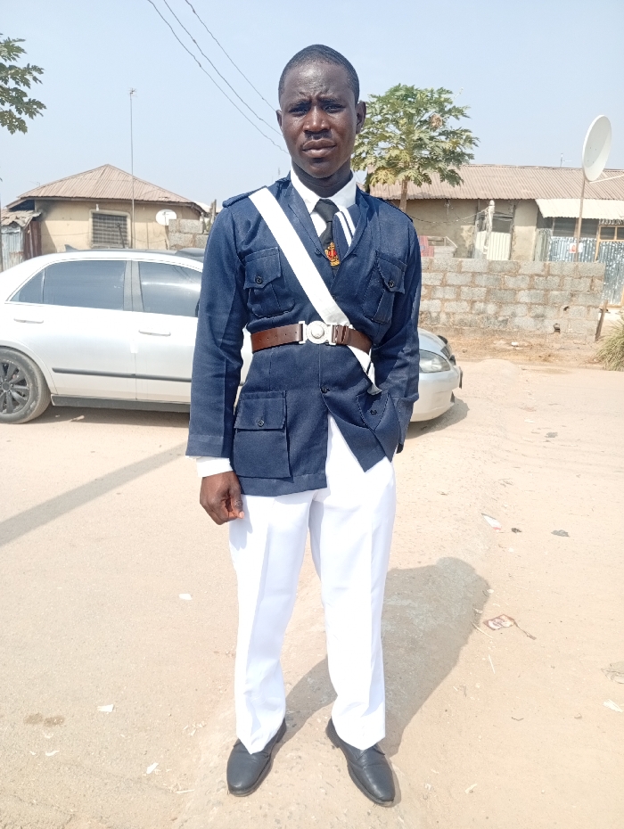 A full-body photograph shows one adult male standing on an unpaved, sandy-colored ground under a clear sky. The man is positioned centrally, facing the camera with a neutral expression. He wears a dark blue long-sleeved uniform jacket with four front pockets, a white shirt, a black tie featuring a red and gold emblem, white trousers, and dark dress shoes. A white sash runs diagonally from his right shoulder to his left hip, and a brown leather belt with a prominent silver buckle is secured over the jacket. His left hand is in his trouser pocket. In the background, a light-colored four-door sedan is partially visible on the left. The scene includes several single-story structures with corrugated metal roofs and concrete block walls, typical of residential buildings in the region. A tall, thin antenna or mast is present behind the man's head on the left, and a satellite dish is visible on the right, near the buildings. A small tree with green leaves stands in the middle-right background. The unpaved ground and architectural style are consistent with a residential or suburban area within Abuja, Nigeria.