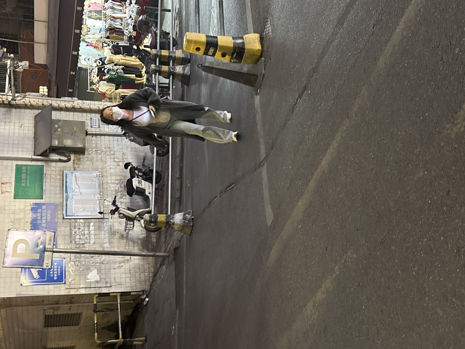This is a nighttime urban street scene in Yuexiu District, China. In the foreground, a dark asphalt road displays faint yellow and white painted lines. Four worn traffic barriers are distributed along the road's edge: two yellow and black striped cylindrical concrete barriers on the left, and two conical barriers (one yellow and black, one dark) on the right. An adult female, positioned in the mid-ground, walks from right to left across the road. She wears a white face mask, eyeglasses, a dark grey long cardigan over a white top, light grey wide-leg trousers, and light-colored flat shoes. She holds a white smartphone in her right hand. The background features a textured, light-colored tiled wall. Mounted on this wall are multiple signs: a blue rectangular parking sign with a white 'P' and Chinese characters indicating "parking lot" and "video surveillance area," a smaller blue sign with a camera icon and Chinese text for "video," a green rectangular sign with Chinese characters, and a large white board displaying a grid-like arrangement of text or numbers. A dark grey utility box is also affixed to the wall. Two white electric scooters, one equipped with a front basket, are parked against a metal railing barrier in front of the wall. To the far right in the background, a brightly lit retail stall or market stand displays clothing on racks and mannequins. The scene is illuminated by artificial light sources, indicating it is nighttime.