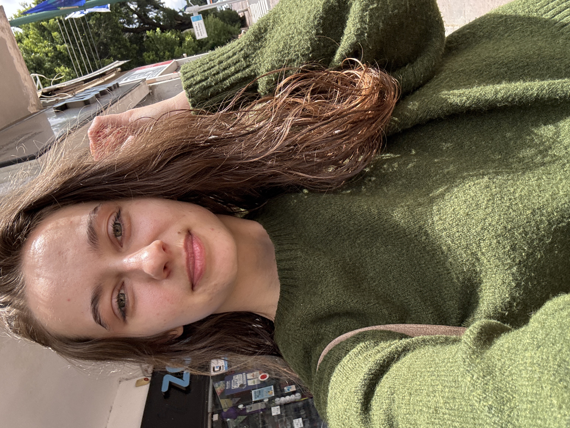 A young adult female is depicted in a close-up outdoor selfie. She has long, wavy brown hair, appearing somewhat damp or styled, with a portion visible over her left shoulder. Her right hand is raised, with fingers lightly touching her hair on the right side of the frame. She wears a dark green, long-sleeved knitted sweater. Her facial expression is a faint, closed-mouth smile. Her eyes are open, light in color, and she looks directly at the camera. The background on the left side of the frame reveals a commercial storefront. A prominent blue letter 'Z' is visible on the store's dark facade. The store window is adorned with multiple stickers, posters, and advertisements featuring Hebrew text. An awning or overhang extends above the storefront. The background on the right side of the frame shows green tree foliage, a utility pole with overhead wires, and what appears to be a light blue street sign or bus stop sign with white Hebrew text. An Israeli flag, characterized by a blue Star of David and blue stripes on a white background, is visible flying from a pole further back. The scene is illuminated by direct sunlight, casting shadows and highlighting the subject's face and hair. The setting is an urban street within Ramat Gan, Israel. The specific street name is not discernable from the visual evidence.