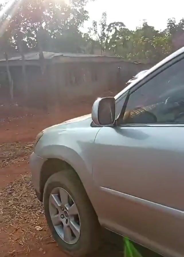 silver Lexus RX SUV parked on a red dirt road. There is a house with a corrugated metal roof visible in the background, along with some trees. The camera pans to show the front of the car and then the rear, and a person wearing a white shirt and shorts walks past. The ground is covered in red dirt, dry leaves, and some small branches. The sun is shining brightly, creating a slight glare.