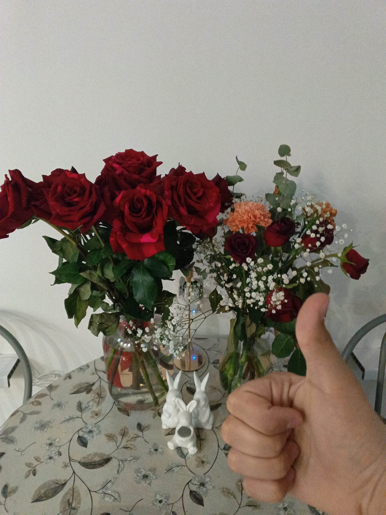 A still life photograph, presumably taken indoors in Andreyevo, Russia, shows two floral arrangements on a round table with a floral-patterned tablecloth. The arrangement on the left contains red roses in a glass vase. To the right, a similar arrangement features a mix of red roses, orange carnations, eucalyptus, and baby's breath, also in a glass vase. In front of the vases, two ceramic bunny figurines sit on the table. A human hand is prominently displayed, giving a "thumbs up" gesture. The backdrop is a plain white wall. Parts of two chairs are seen at either side.