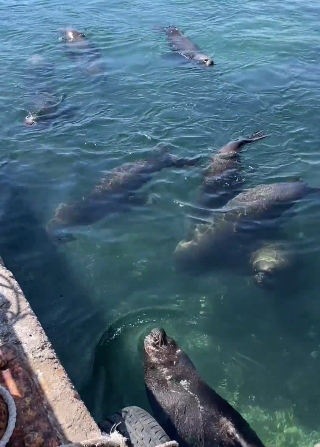 The video opens with a view from a concrete pier, looking down at several sea lions swimming in clear, turquoise water. One sea lion is close to the pier, resting against a tire used as a bumper. As the camera zooms out, more sea lions are visible, their dark bodies contrasting with the light-colored water. In the background, a coastal city is visible, with buildings and mountains forming the horizon. Several small boats are scattered across the water, completing the scenic view. The sky is a clear blue, with a few wispy clouds adding texture to the scene. The pier is weathered, with rust and fraying ropes visible. The overall impression is of a sunny day at the coast, with wildlife adapting to the presence of urban development.