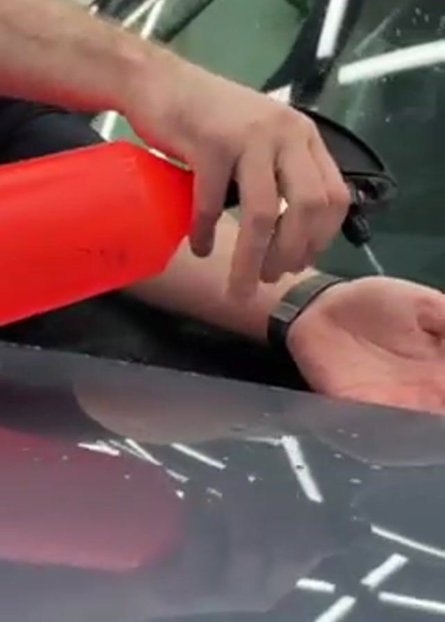 A man sprays liquid from a red spray bottle onto his left hand while standing in front of the hood of a gray car. He wears a black watch on his wrist and sprays in front of a clear glass windshield. The environment appears to be a brightly lit garage or detailing shop with fluorescent lights overhead.