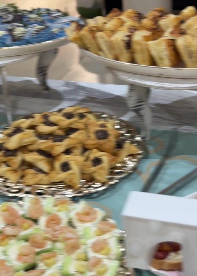 table laden with assorted appetizers. There are several silver platters containing different kinds of small bites. One platter has what appears to be celery sticks filled with a creamy substance and topped with shrimp. Another platter holds small puff pastries. Another displays toasts or crackers with olives, peppers, and other toppings. A raised platter in the background features blue chocolate-covered strawberries with white sprinkles. The table is covered with a blue and green tablecloth. A person is briefly seen near the beginning of the video. There are serving tongs present on the table. A white decorative letter “T” is also visible in the foreground.