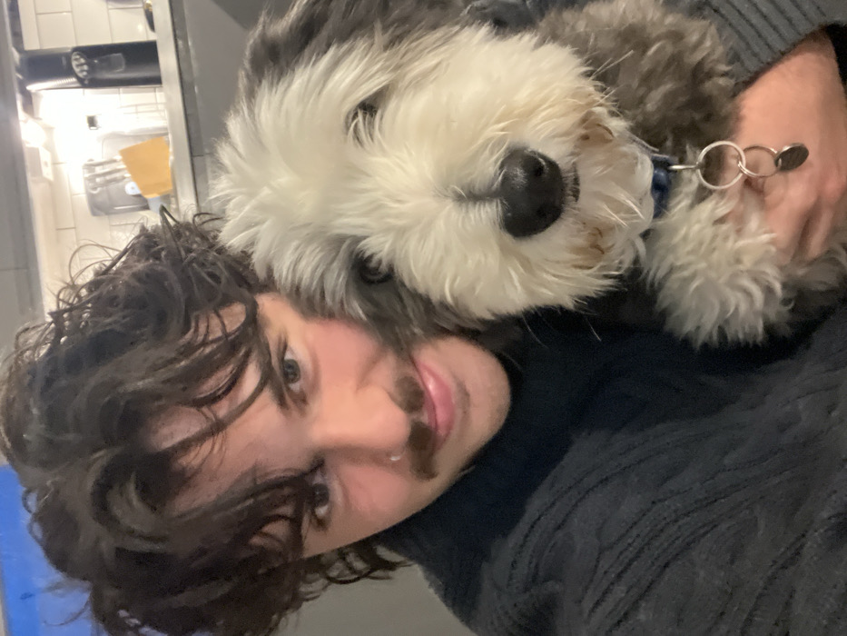The image depicts an indoor scene with a male subject embracing a dog. The male, positioned on the left, has dark, wavy hair, a mustache, and a silver nose ring on his left nostril, looking directly at the camera with a slight smile. He wears a dark, cable-knit sweater. The dog, positioned to the male's right, is a medium-sized animal with shaggy white and dark grey fur, a dark snout, and eyes partially obscured by fur. It wears a blue collar with multiple silver rings and a dark, circular tag. The male holds the dog with his right arm. The background, mostly out of focus, indicates a domestic kitchen, featuring white subway tile backsplash, dark countertops, and a black coffee maker on the counter. The location is in the city of Unknown, Unknown.