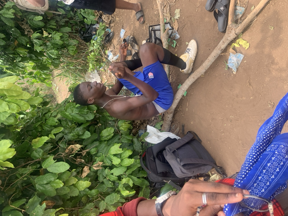 The image depicts an outdoor scene in Ihiagwa, Nigeria, involving three individuals. In the center, an adolescent male, appearing shirtless, sits on a horizontal tree branch. He wears blue athletic shorts with a "USA" logo, black knee-high socks, and white and gold athletic shoes. A white rosary necklace with a cross pendant hangs around his neck. His hands are positioned forward, seemingly manipulating an object out of frame. To the left, a person's forearm, clothed in red, displays a silver-banded watch and a silver ring. This individual holds a blue patterned cloth or bandana and a pair of eyeglasses. Two black backpacks rest on the reddish-brown dirt ground near this person. To the far right, the lower legs and feet of a third individual are visible, wearing black shorts and dark sandals. The ground beneath the subjects is bare earth, scattered with plastic wrappers and other debris. Dense green foliage from various plants forms the background, with a lighter, unpaved area or path visible further back on the right.