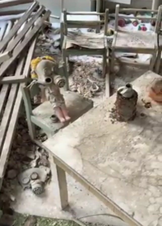 dilapidated room, likely a kindergarten classroom, filled with decaying furniture and scattered toys. A doll wearing a gas mask sits on a small chair. A child's table is covered with assorted toys, including a wooden stacking tower, a bowl, a child's shoe, and other unidentifiable objects, all coated in dust and debris. Broken wooden pieces litter the floor. Several small, empty chairs are arranged around the table. The room is in a state of significant disrepair, suggesting long-term abandonment and neglect.