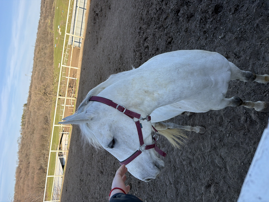 The image displays an outdoor equestrian scene located in Arbanassi, Bulgaria. A white horse, wearing a dark red halter with silver buckles, stands centrally, its head and upper body turned slightly left. A human hand, clad in a dark sleeve and featuring a red string on the wrist, is visible on the far left, extended towards and appearing to make contact with the horse's left cheek. The horse stands on dark, tilled earth, indicative of a riding arena. In the mid-ground, a white wooden fence separates the foreground from a green field containing a white corrugated metal building and several small, colorful obstacles. The far background consists of a hill densely covered with bare deciduous trees beneath a clear blue sky. The scene is brightly illuminated by natural daylight.