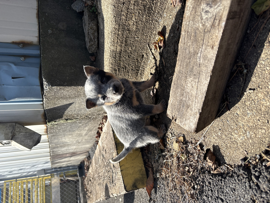 A small, gray and brown Australian Cattle Dog puppy is positioned on uneven ground, next to some steps