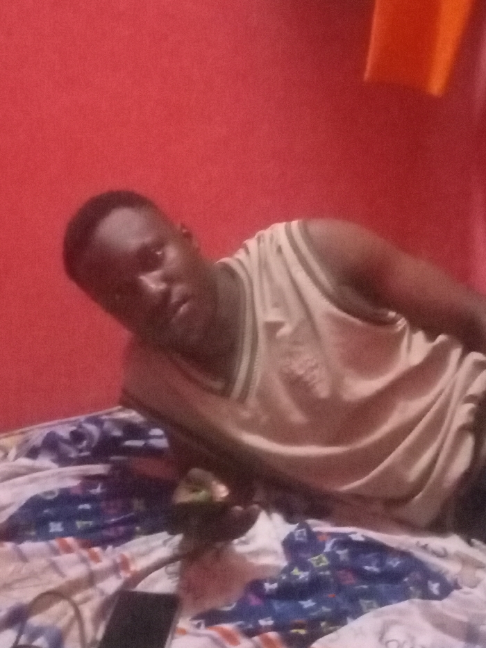 A man reclines on a bed covered with patterned sheets, his head propped up on his left hand. He wears a tan sleeveless shirt with a V-neck. A cell phone rests on the bed near his hand. Behind him, a red wall provides a stark backdrop, broken only by a hanging orange cloth in the top right corner. The lighting is subdued.