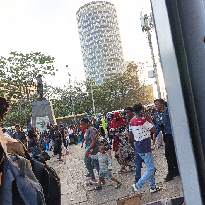 - "The image captures a crowded outdoor urban scene in Nairobi, Kenya, positioned at the plaza in front of the Kenyatta International Convention Centre (KICC) and the Jomo Kenyatta statue" by FM-SVsgu1, licensed under CC BY 4.0