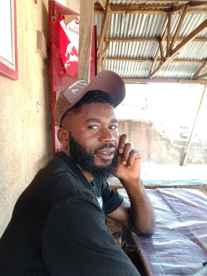 A male individual with dark skin, a full black beard, and short dark hair, is depicted in an upper body shot, facing slightly right and looking directly at the camera with a slight smile. He wears a black short-sleeved t-shirt and a brown, mesh-back baseball cap worn backward. His left arm is bent, with his left hand raised near his chin, fingers lightly curled. A ring is visible on his left ring finger. He appears to be seated at a table, partially visible in the bottom right, covered with a purple and white patterned material. The scene is located in Jos, Nigeria, within what appears to be an open-sided structure. To the left of the individual, a light-colored wall shows signs of wear. On this wall, a red-framed object is visible. Further right, behind the individual's head, is a red wooden frame or panel with a partially torn paper advertisement affixed to it, featuring "Coca-Cola" and "enjoy Chri..." (likely Christmas) text. A vertical wooden beam stands between this advertisement and the individual. Above, a corrugated metal roof is supported by a framework of wooden beams. The background beyond the structure is out of focus, showing a light-colored building wall and an expanse of bright sky.
