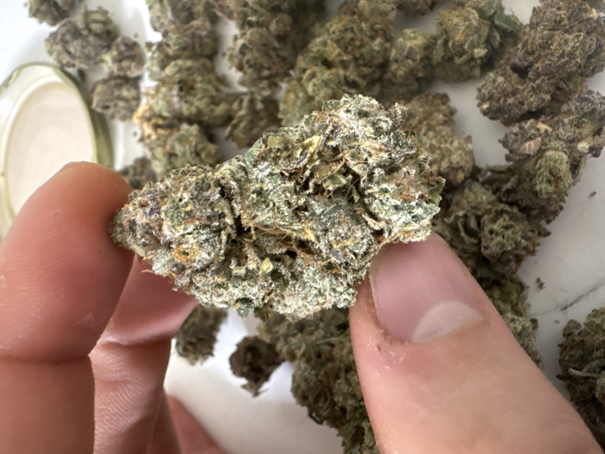 person holding a cannabis bud between their thumb and forefinger