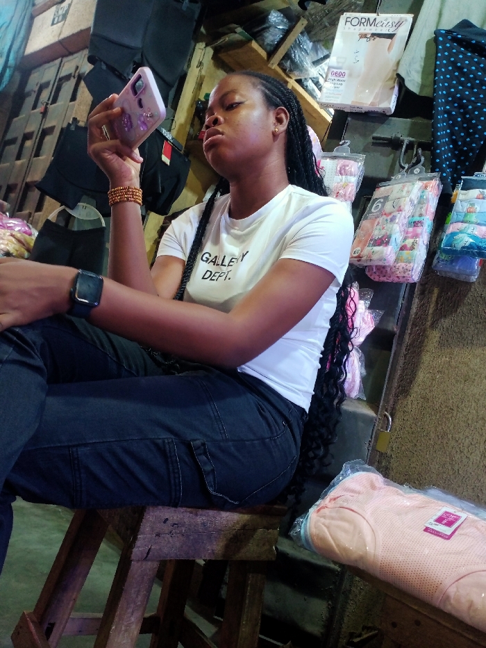 A young woman with braided hair sits on a wooden stool, holding a pink phone with a decorated case. She wears a white t-shirt, dark jeans, a smartwatch, and beaded bracelets. Merchandise surrounds her: packaged underwear hangs above, and other items rest on nearby surfaces. The setting appears to be a market stall. The lighting is subdued, highlighting the items for sale.