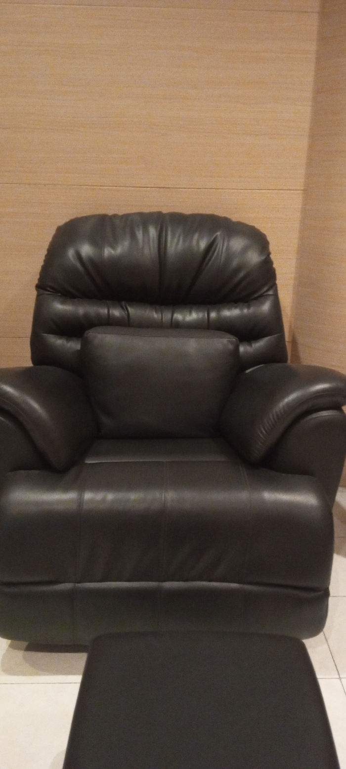 The scene depicts an interior space, purportedly located in the city of Aral, Kyrgyzstan. A dark, likely black or very dark brown, padded leather armchair is positioned centrally, facing the viewer. The armchair features a segmented backrest with a distinct headrest area, a separate rectangular lumbar cushion, and rounded, upholstered armrests. Stitching lines are visible on the chair's seat and backrest. A matching dark ottoman or footrest is partially visible in the lower foreground, situated directly in front of the armchair. The background consists of a wall paneled with light-brown, horizontally oriented wooden boards. The floor is composed of light-colored tiles. No individuals or actions are depicted in the image.