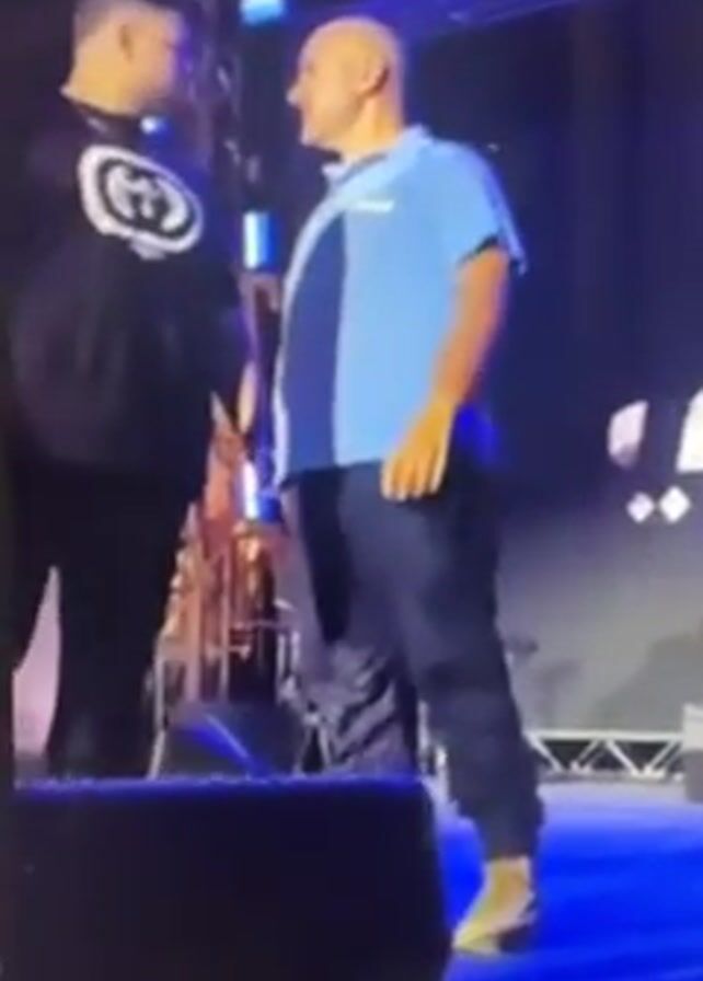 stage bathed in blue light. Initially, a bald man in a blue polo shirt and dark pants stands talking to someone in a black shirt. The camera then pans to show a young woman in a neon yellow crop top and baggy blue pants walking on stage. The man in the black shirt faces the camera. There are stage lights and equipment visible. People seem to be walking around on the stage. Loud music is playing in the background.