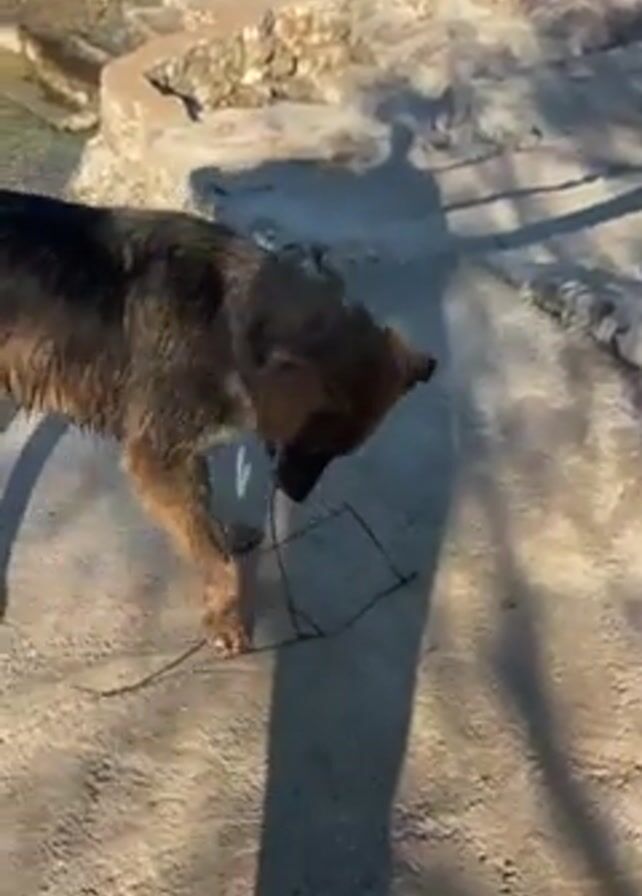 A medium shot shows a medium-sized dog sniffing a thin, dark object on a concrete surface. The dog has short, wet, dark and tan fur. It moves its head and muzzle around to examine the object with its nose. The surface it stands on is uneven and appears to be a path or walkway made of poured concrete. To the right of the path, there's a slightly elevated edge with a wall constructed from light-colored stones. In the background, there appears to be a multi-tiered structure also made of stones, with a hint of water visible among the stones. The sun is shining, casting strong shadows on the ground, including the shadow of the person recording the video.