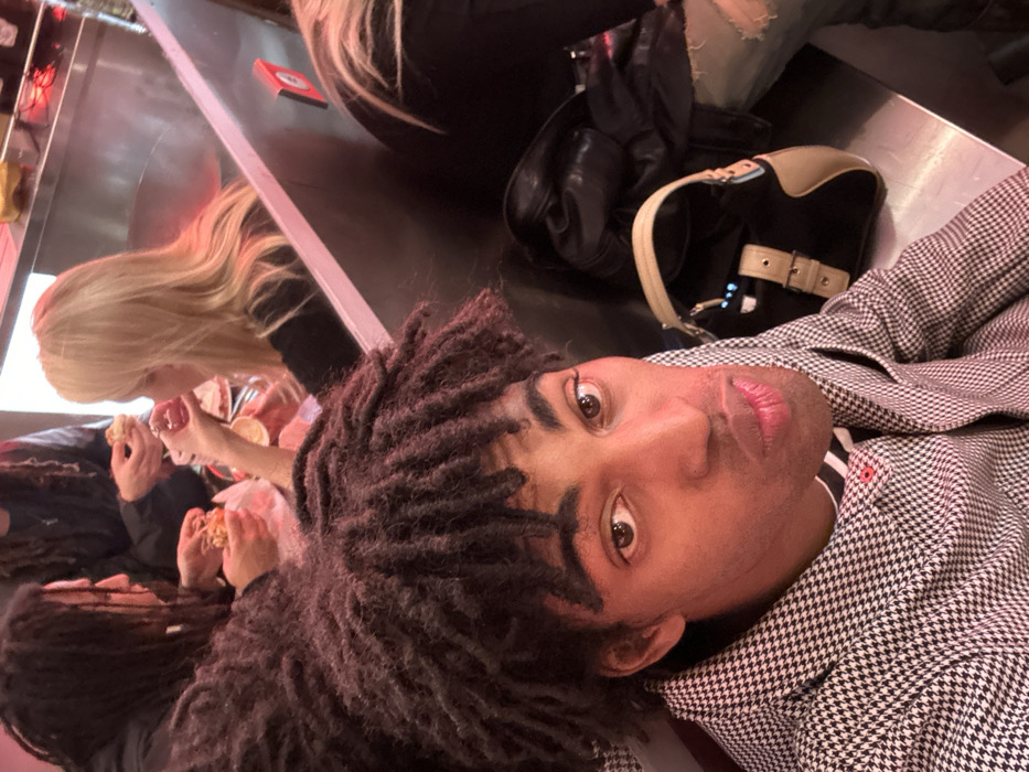 The image captures a selfie taken from a low angle within an indoor casual dining establishment in Paris, France. The specific location within the city is not identifiable. In the foreground, a young male with dark skin and dark dreadlocks extending upwards looks directly at the camera with a pouting expression. He wears a black and white houndstooth patterned jacket over a striped top with a red accent. Adjacent to him on a metallic counter surface, a black and tan handbag with a prominent buckle and a black leather jacket are present. In the midground, to the left, two individuals with dark dreadlocks are partially visible; one is holding and consuming a food item wrapped in white paper. To the right, a blonde female, seated and facing left, holds a small, translucent red object, likely a beverage or dessert. A fourth individual, partially visible on the far right, also has blonde hair and wears ripped denim. The environment features metallic counters and partitions, with a visible red illuminated strip along one partition and a red rectangular sign with a white symbol. The overall scene depicts a group engaged in dining and social interaction.