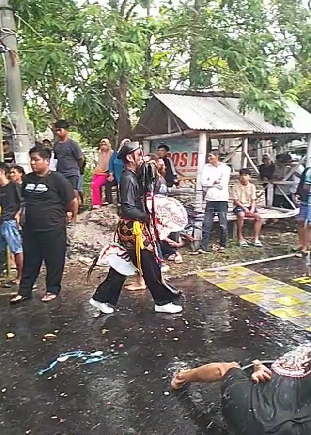 several people outdoors. Some stand and watch as two people in black clothing lie on their backs, partially under a large, open-topped barrel of water. Another person stands by the barrel and appears to be pouring water from the barrel onto the people lying underneath. The surrounding environment includes a building with a metal roof, trees, and other people watching the scene. It seems to be a public event.