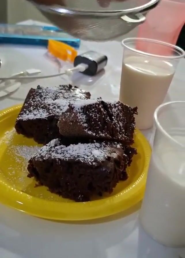 dessert being prepared. The main focus is on a yellow plastic plate with three pieces of what appears to be chocolate brownie or cake. The cake is dusted with powdered sugar being sifted over it from a metal strainer. Next to the plate are two clear plastic cups filled with a white liquid, presumably milk. The scene is set on a white table, with other items like an orange object, a black and silver item, and a blue case scattered around. A pink plastic container is visible in the background. The camera angle shifts slightly, capturing different perspectives of the dessert and drinks.