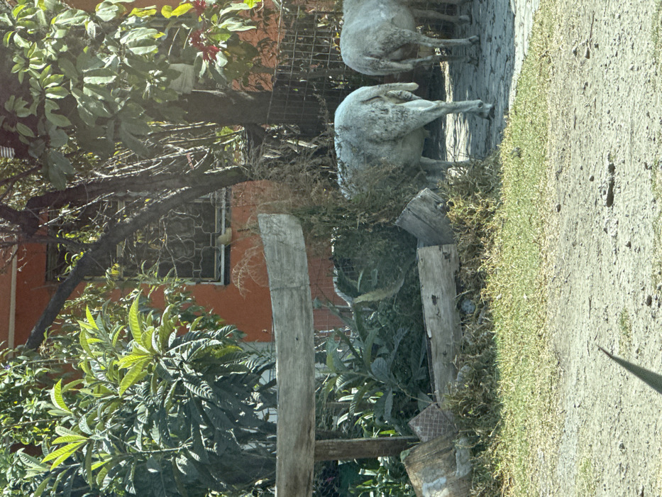 Two white sheep statues stand on a dirt and grass path next to a wooden fence and leafy green trees. An orange building with a barred window is visible in the background. The statues are positioned one behind the other.