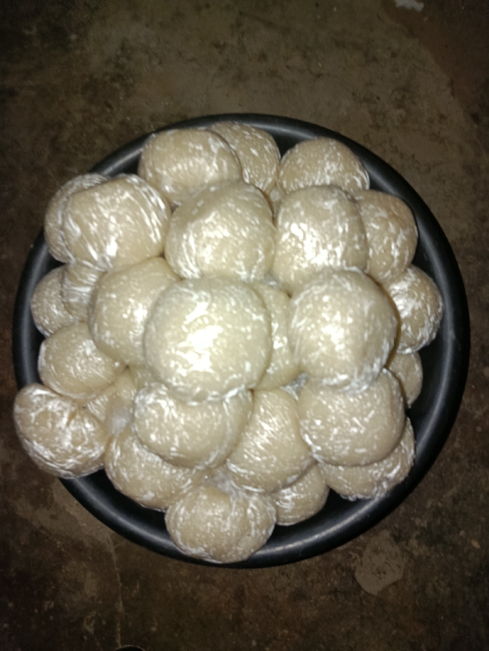 - "A black bowl is filled to the brim with many light-colored, round food items" by FM-IKOJ42, licensed under CC BY 4.0