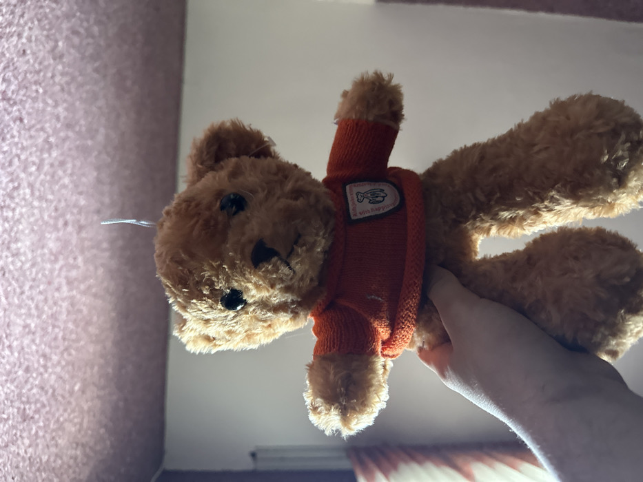 A plush, light-brown teddy bear wears an orange knitted sweater. A tag, bearing text and a lobster drawing, is attached to the sweater. A human hand holds the bear up, with the background including a pink patterned wall, a white ceiling, and the top of curtains. The bear's head is angled towards the left, featuring black button eyes and a stitched black nose. A thin white string extends from its head.