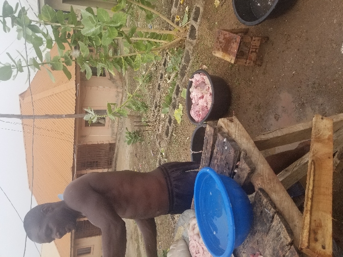 A man, shirtless and wearing black shorts, is preparing raw meat outside a house. He stands near a wooden table with a blue bowl of water and several pieces of raw meat on it. There are also two black plastic containers with raw meat. The man is in a dirt yard. There is a small wooden stool to the right and a single-story house in the background. There are multiple plants behind the house. The location is in the city of Pati Ridge, Nigeria.