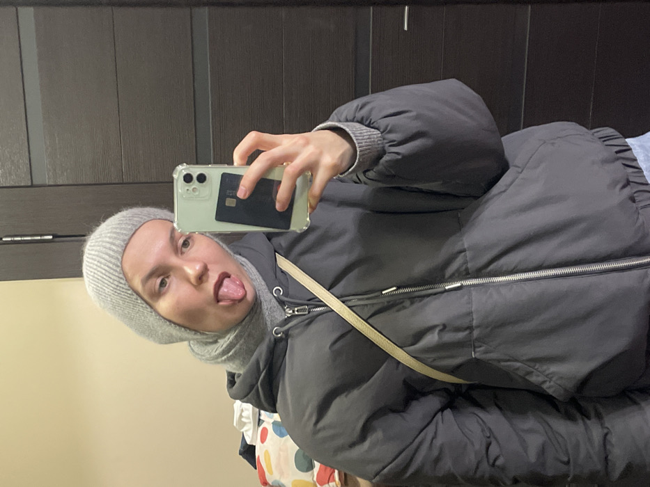 A person wearing a grey balaclava and a puffer jacket takes a selfie in front of a dark wooden door. The person sticks their tongue out. They hold a phone with a black card attached to the back. A thin strap drapes across the jacket. Part of a colorful patterned garment is visible in the lower left corner. The background is out of focus.