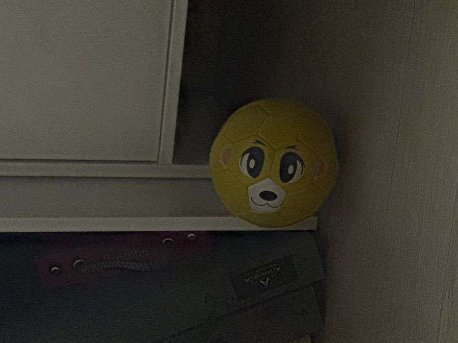 A yellow ball with a cartoon bear face sits on a shelf within a partially visible cabinet