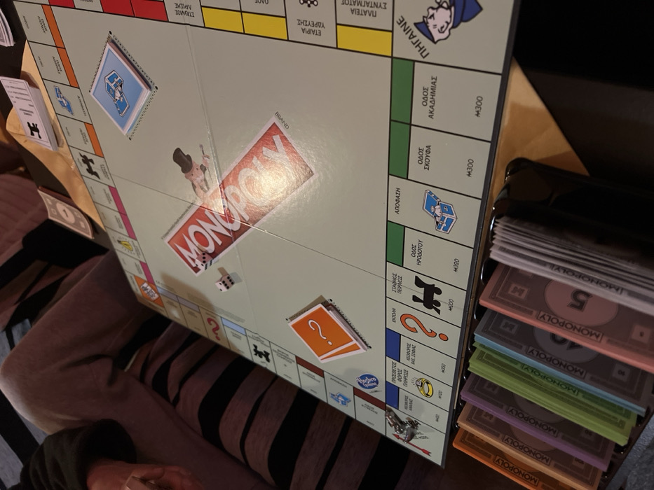 - "The image displays a Greek-edition Monopoly board game actively being played indoors within the Gerakas Municipal Unit, Greece" by FM-3sCVc2, licensed under CC BY 4.0