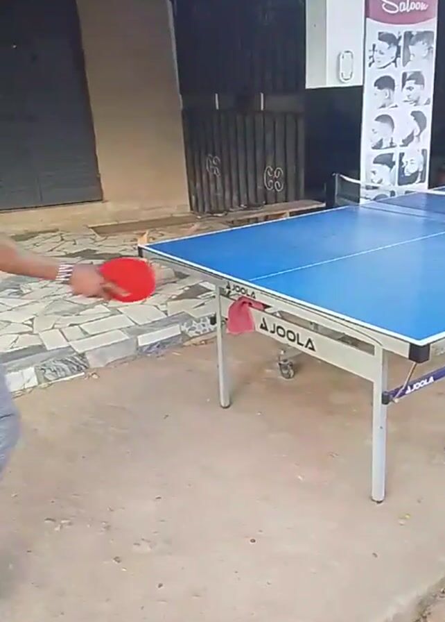 - "Two men are playing ping-pong on a blue JOOLA table that is set up outside of a barber shop called NWA 042 Barbing Saloon" by FM-Jqbih2, licensed under CC BY 4.0