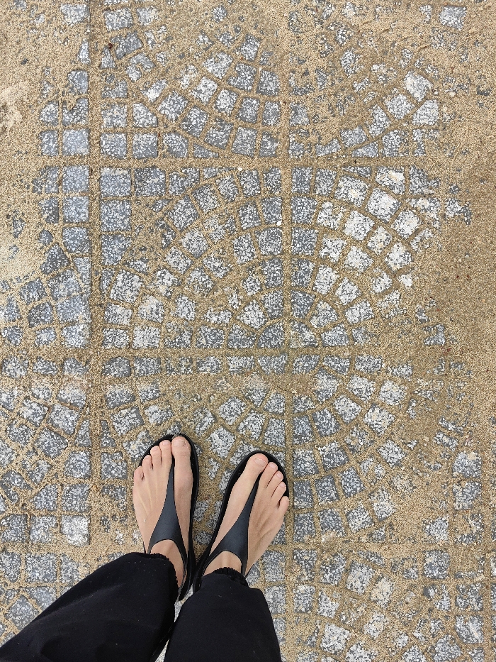 The image depicts a top-down view of a person's lower legs and feet, located in Thuận An Ward, Vietnam. The individual wears black pants and black thong sandals. They are standing on a paved surface constructed from small, square-cut stones in varying shades of grey, arranged in a repeating pattern resembling interconnected fan or radial motifs. A layer of light brown sand and fine dirt partially covers the paved surface, accumulating in the crevices between the stones and obscuring parts of the pattern.