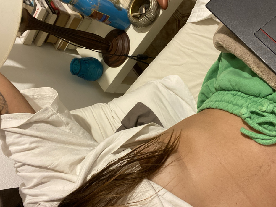 The image depicts an indoor bedroom scene in Barcelona, Spain. A person is reclining on a bed covered with white sheets and pillows. Their tanned torso is visible, partially obscured by long, dark hair draped over their left shoulder. They are wearing a white t-shirt, revealing a tattoo on their upper right arm, and green drawstring shorts. A dark grey accent pillow is visible behind the person's back. To the right of the bed, a white nightstand holds a dark wooden table lamp with a cream-colored shade. Behind the lamp, a stack of books is visible against the light-colored wall. Also on the nightstand are a textured turquoise vase, a light blue plastic bottle, and a decorative metallic ashtray containing a partially smoked cigarette or joint. In the lower right foreground, a dark laptop computer rests on a light brown, possibly plush, surface. The floor visible beneath the nightstand is tiled with light-colored, geometrically patterned tiles.