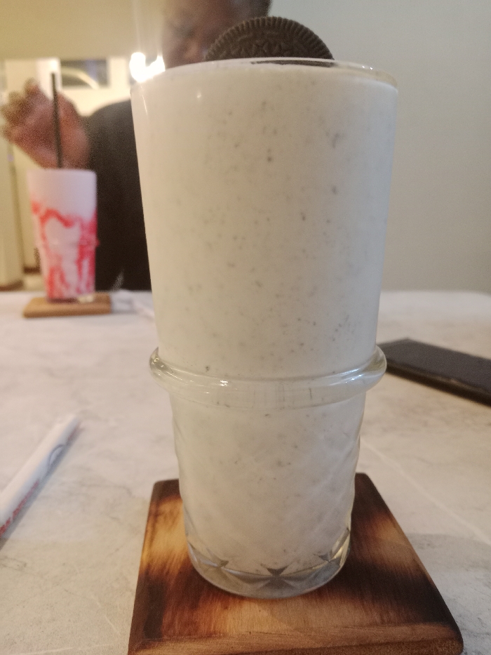 glass of milkshake, with a black and white cookie on top, sitting on a wooden coaster. The coaster is on a white, marble-like table. There is a white marker laying on the table to the left. There is a person in the blurry background on the left, wearing a dark shirt. The location is in the city of Eldoret, Kenya, at the coordinates latitude: 0.52, longitude: 35.268.